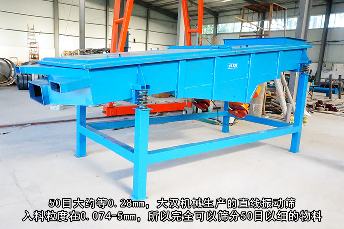 50目指在一平方英寸的面積上有50個(gè)孔,50目大約等0.28mm,大漢機(jī)械生產(chǎn)的直線振動(dòng)篩入料粒度在0.074-5mm,所以完全可以篩分50目以細(xì)的物料。同時(shí)直線振動(dòng)篩適合篩分物料含水量要小于70%、無粘性的各種干式粉狀物料。