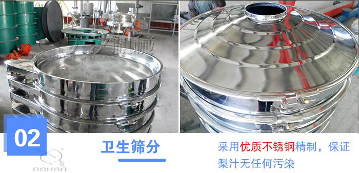 不銹鋼振動篩的篩分精度非常高,細可達0.028mm(500目),適用于各種液體和超微細粉末的篩分,可以保證梨汁的精準篩分、過濾、除雜,同時篩網(wǎng)可以安裝1-5層,篩分出六種不同粒度規(guī)格的的梨汁,保證了梨汁的口感,能夠適用于客戶不同的需求,功能非常強大。