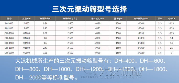 大漢機械所生產的三次元旋振篩型號有:DH-400、DH--600、DH--800、DH--1000、DH--1200、DH--1500、DH--1800、DH--2000等標準型號。