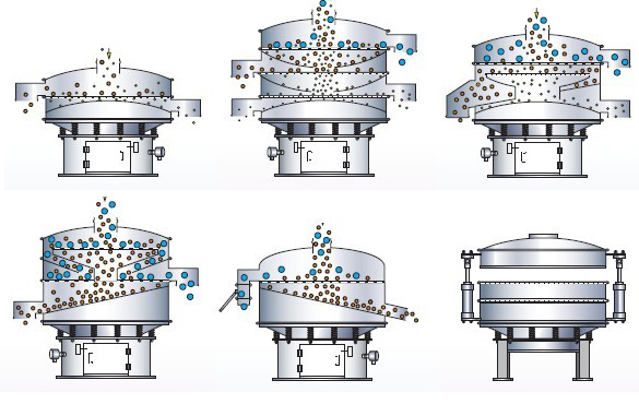 采用立式振動電機作為激振源,通過振動電機上下兩端的偏心重錘將旋轉(zhuǎn)運動轉(zhuǎn)變?yōu)樗?、垂直、傾斜的三次元運動,并傳遞到旋振篩的篩面上;物料通過入料口進入設(shè)備內(nèi),根據(jù)不同物料篩分要求,物料經(jīng)過1-5層采用不同目數(shù)的金屬編織篩網(wǎng)的篩分層,在這個過程中,位于各層的篩網(wǎng)下的清網(wǎng)裝置(硅膠彈跳球)通過頻率振動不斷撞擊篩網(wǎng),使篩網(wǎng)上層物料能夠順暢的透網(wǎng)篩分,并有效解決了物料堵網(wǎng)問題出現(xiàn),不同目數(shù)的物料通過各層對應目數(shù)的篩網(wǎng)后在各層的出料口排出,終實現(xiàn)篩選除雜或過濾分級的目的。