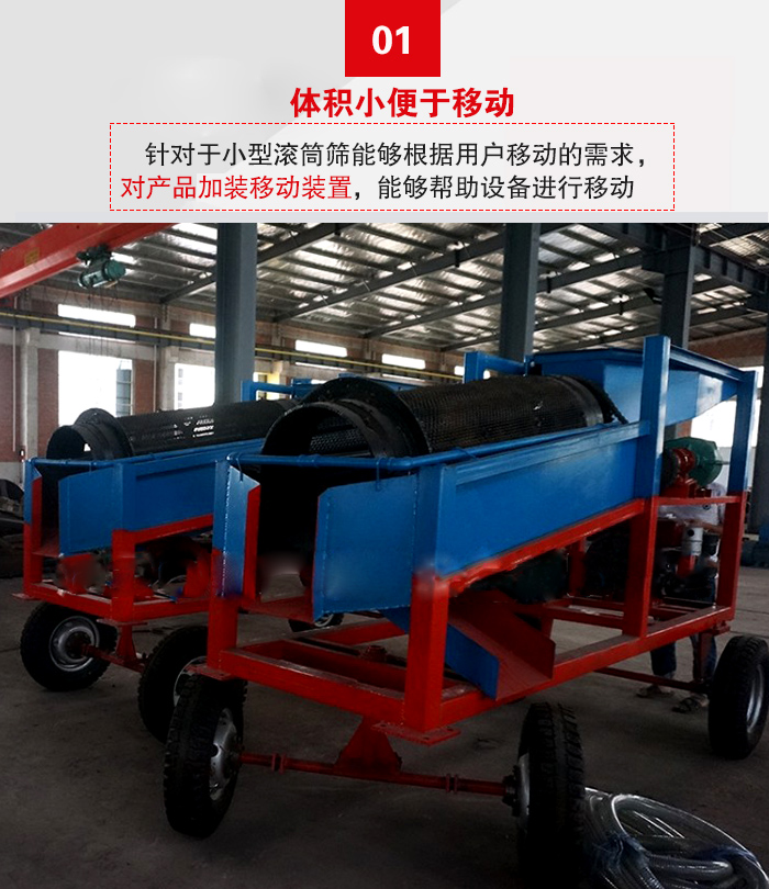 針對(duì)于小型滾筒篩能夠根據(jù)用戶移動(dòng)的需求,對(duì)產(chǎn)品加裝移動(dòng)裝置,能夠幫助設(shè)備進(jìn)行移動(dòng),從而滿足用戶的需求。