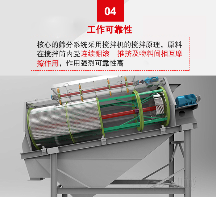 其核心的篩分系統(tǒng)采用攪拌機(jī)的攪拌原理,原料在攪拌筒內(nèi)受連續(xù)翻滾、推擠及物料間相 互摩擦作用,作用強(qiáng)烈可靠性高。