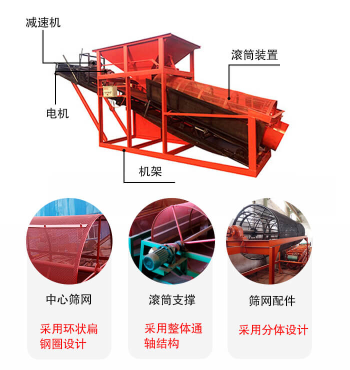 滾筒篩土機(jī)主要由:電機(jī),減速機(jī),滾筒裝置,機(jī)架,密封蓋等組成,