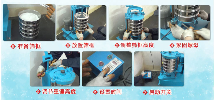 粒度振篩機(jī)電機(jī)通過同步帶,帶動(dòng)齒輪變速后使主軸轉(zhuǎn)動(dòng),主軸帶動(dòng)偏心輪使滑板帶動(dòng)試驗(yàn)篩左右搖動(dòng),同時(shí)帶動(dòng)頂桿齒輪轉(zhuǎn)動(dòng),頂擊拍錘,拍擊試驗(yàn)篩,使試驗(yàn)篩、分樣篩中的物料篩分。