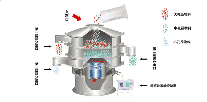 超聲波篩分機(jī)使用智能振動超聲控制器,改變了單一頻率帶來不適應(yīng)性和不可調(diào)性,振動篩振頻每秒1460次,超聲波每秒3.6萬次,在振動超聲控制器的控制下,實(shí)現(xiàn)物料的篩分目的。