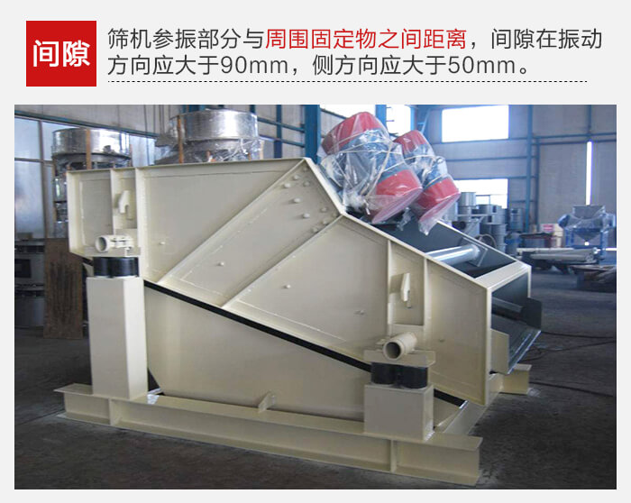 篩機(jī)各部分連接必須牢固可靠,所有螺栓不得有松動。篩機(jī)上參振部分與周圍固定物之間的間隙在振動方向應(yīng)大于90mm,在側(cè)方向應(yīng)大于50mm.