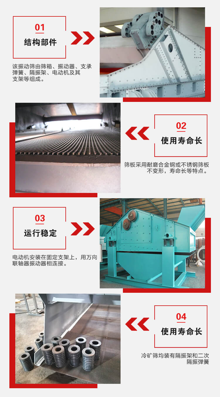 該系列振動篩由篩箱、振動器、支承彈簧、隔振架、二次隔振彈簧、電動機(jī)及其支架等組成。