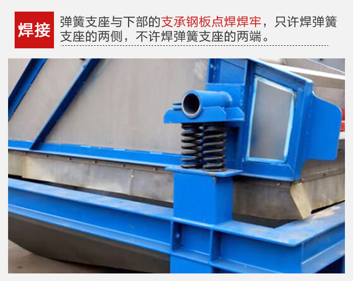 振動器各部分安裝完畢,調(diào)整好相對位置,各處的一次、二次隔振動彈簧均呈垂直狀態(tài)后,把彈簧支座與下部的支承鋼板點(diǎn)焊焊牢。焊接時,只許焊彈簧支座的兩側(cè),不許焊彈簧支座的兩端。