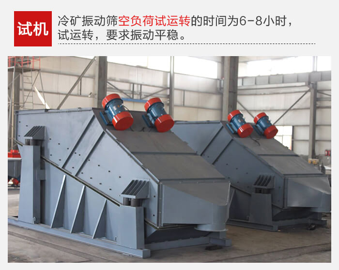 冷礦振動篩空負(fù)荷試運(yùn)轉(zhuǎn)的時間為6-8小時,試運(yùn)轉(zhuǎn),要求振動平穩(wěn),無橫向擺動及不正常響聲。如發(fā)現(xiàn)上述問題,應(yīng)及時檢查原因,排除故障。