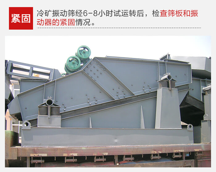 冷礦振動篩經(jīng)6-8小時試運(yùn)轉(zhuǎn)后,應(yīng)檢查篩板和振動器的緊固情況,如發(fā)現(xiàn)松動應(yīng)及時擰緊,振動器軸承工作溫度應(yīng)75℃。